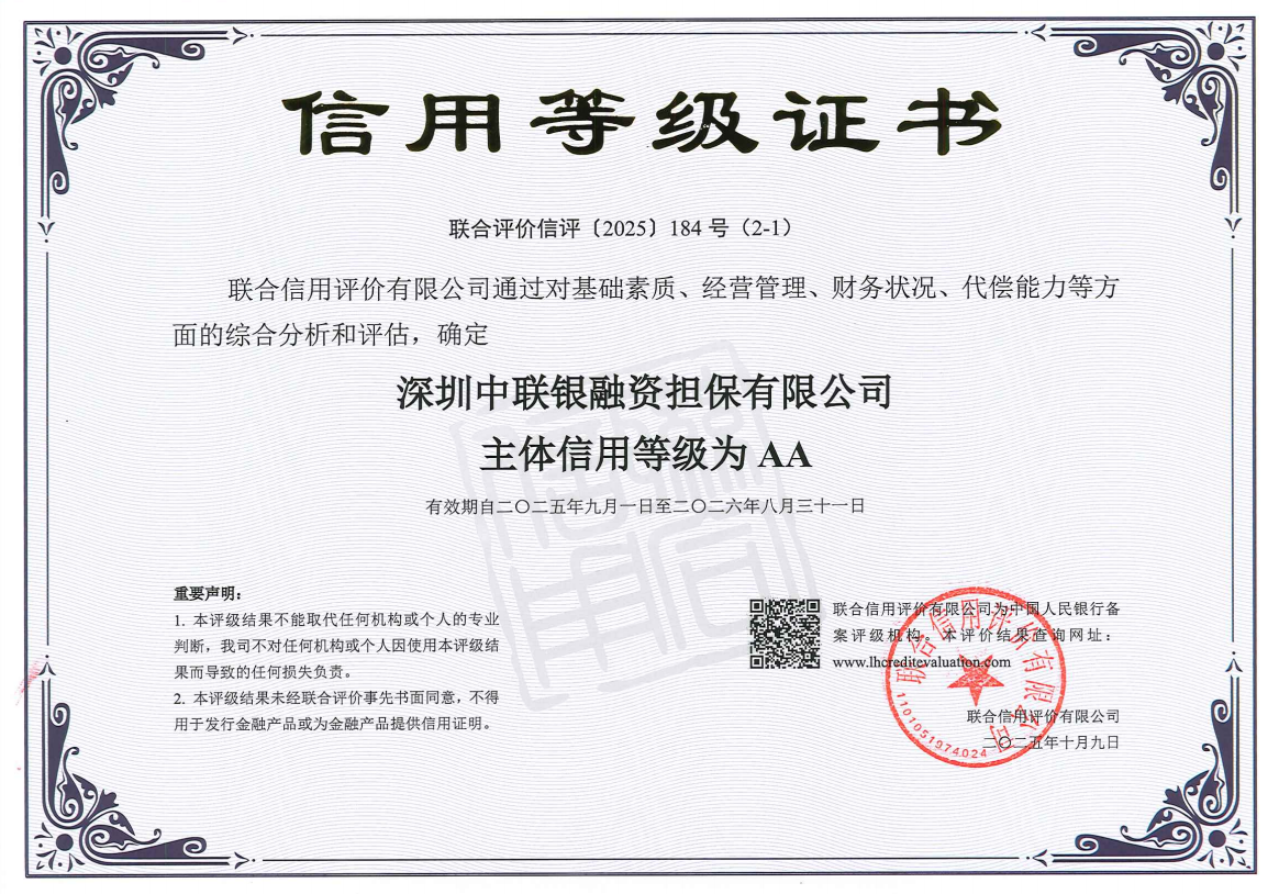近日,经国内权威机构-联合信用管理有限公司综合评定,深圳中联银融资担保有限公司(以下简称“中联银”)资信等级确认为AA级。这标志着中联银自2016年起,已连续十年蝉联此项殊荣,其卓越的经营水平、稳健的财务状况、卓越的履约能力及全面的风险控制体系再获权威背书。
